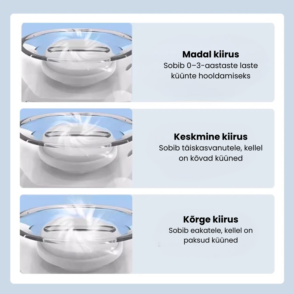 TURVALINE JA VAIKNE – Töötab vaikselt ja ühtlaselt minimaalse müratasemega. Ei kahjusta küünealust ega nahka ning sile, ümardatud korpus hoiab ära kriimustused – piisavalt turvaline isegi imikutele.