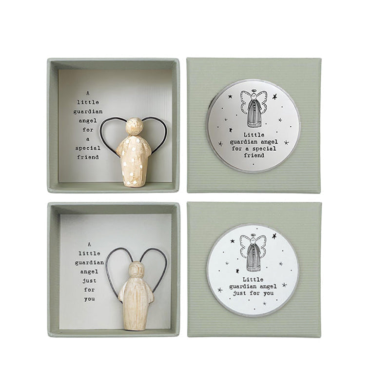 - Isiklik puudutus: Väike puidust ingli figuur elegantsete lõngast tiibadega ja tekstiga „Väike kaitseingel erilisele sõbrale“.