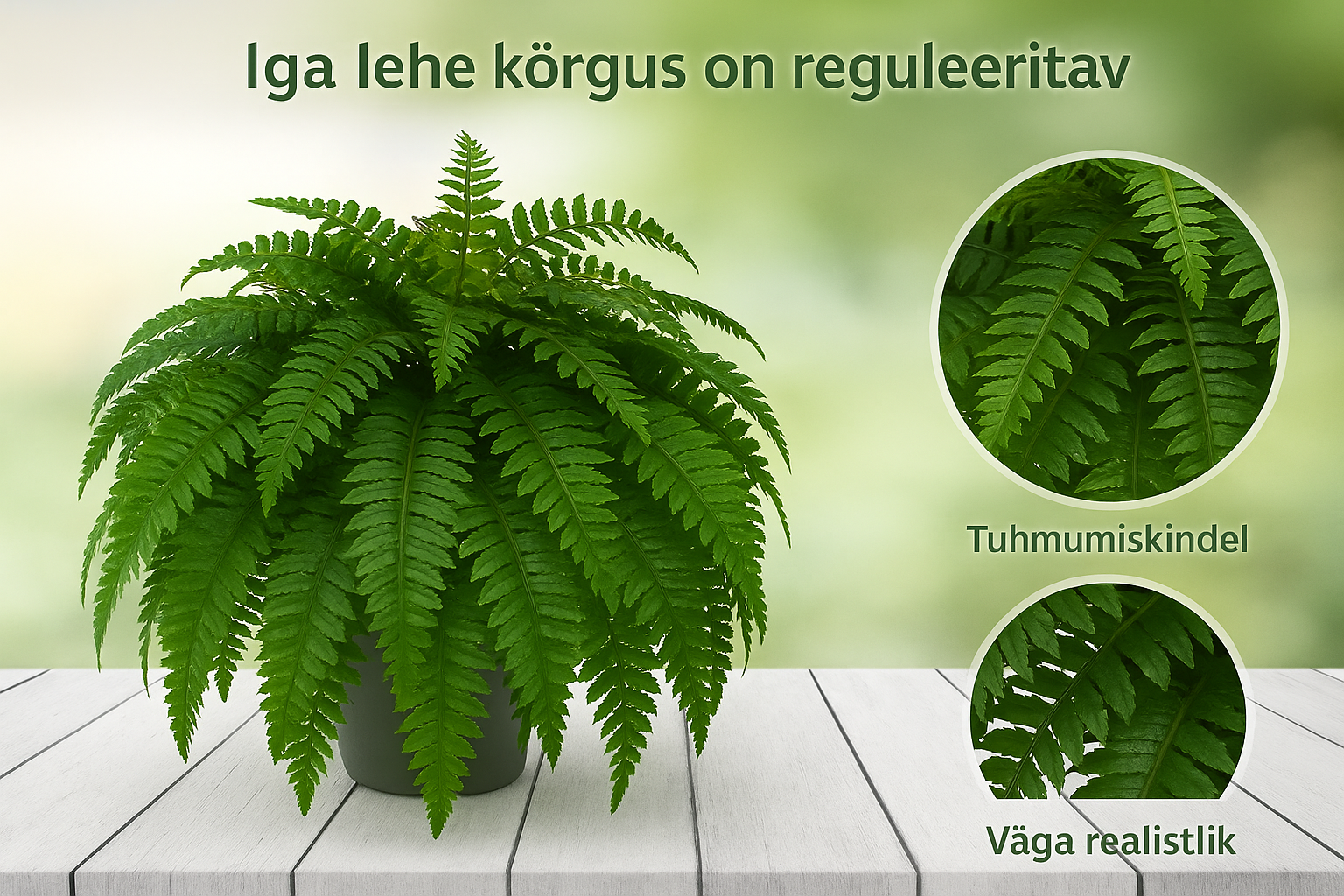 Tihedad ja erksad rohelised taimed loovad alati õitseva kevade mulje. Lehed ei pudene, värvid ei tuhmu. 100% mittetoksilised, ohutud lastele ja keskkonnale, elegantse ja elava välimusega.
