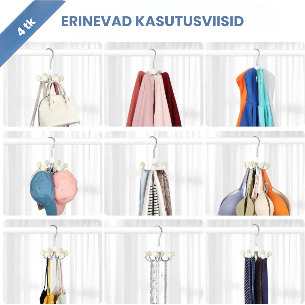 Tänu kroomitud S-kujulisele konksule, mis pöörleb täielikult 360°, saad lihtsalt keerata hoidikut soovitud riide või eseme poole – pole vaja seda maha võtta ega segamini rihmadega võidelda.