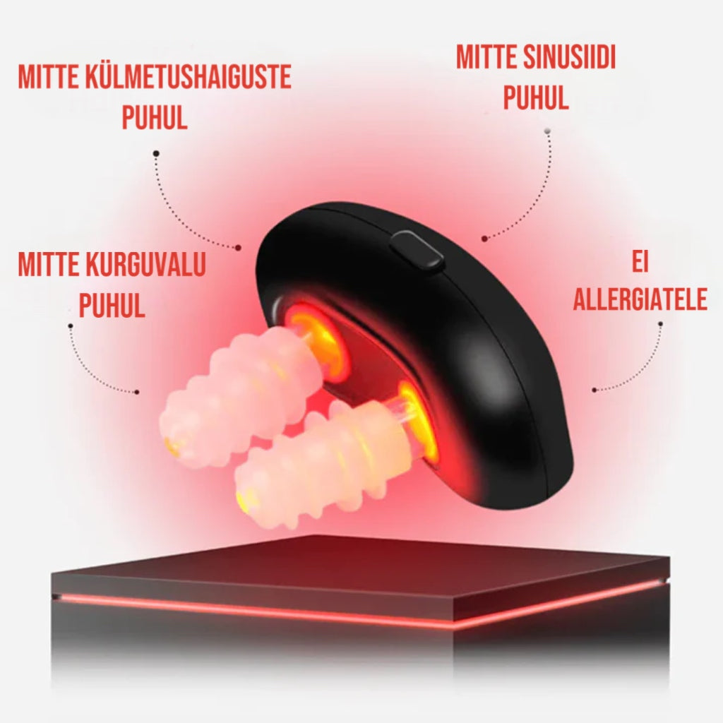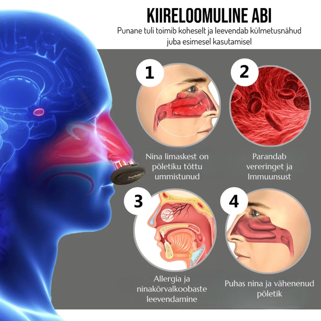 1 - Rotlicht teraapia (660 nm): seade kasutab 660 nm infrapunavalgust, mis kliiniliselt tõestatult parandab rakkude ainevahetust ja vähendab nina põletikku.