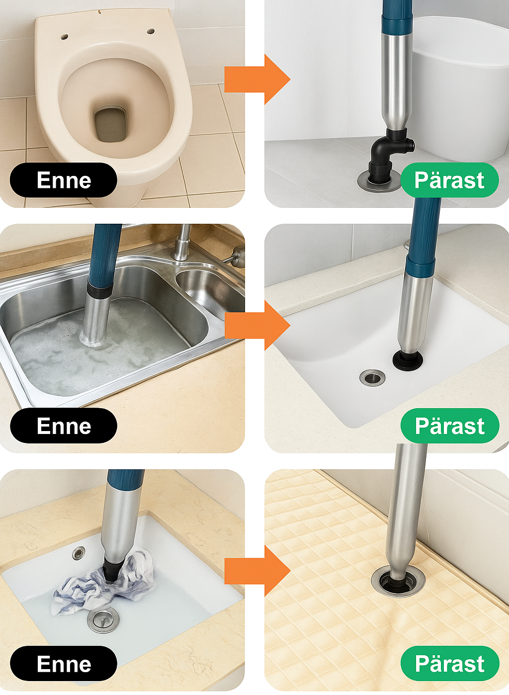 Lihtsalt vajuta pumpa paar korda – rõhk koguneb ning ühe vajutusega eemaldatakse ummistus. Kiire, lihtne ja tõhus.