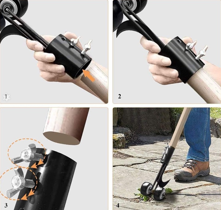 Käsitlusvahendil on kruviliides, millesse tuleb lihtsalt sobiv puupulk sisestada ja see kinni tõmmata. See on väga lihtne ja tõhus umbrohutõrjesüsteem.
